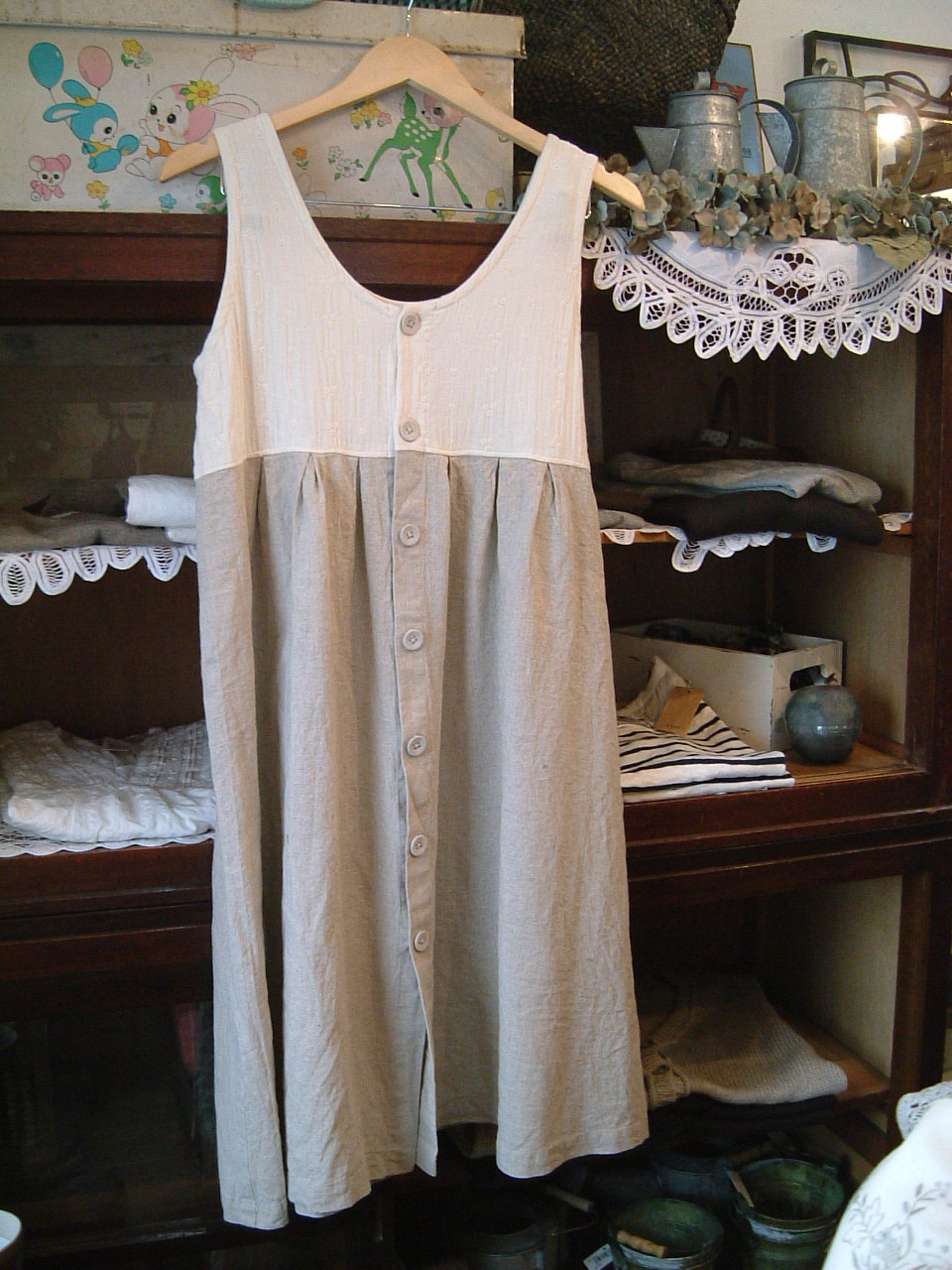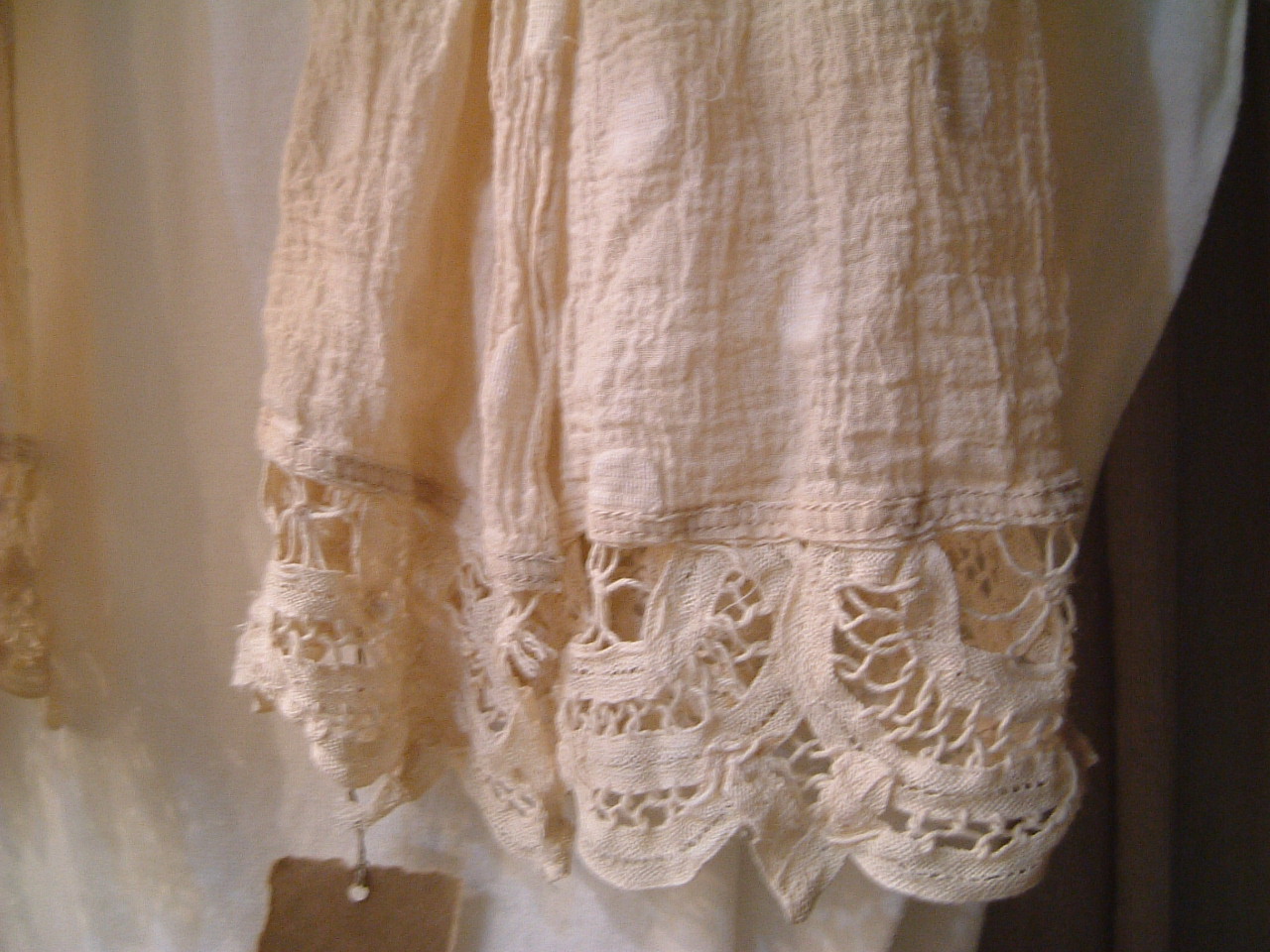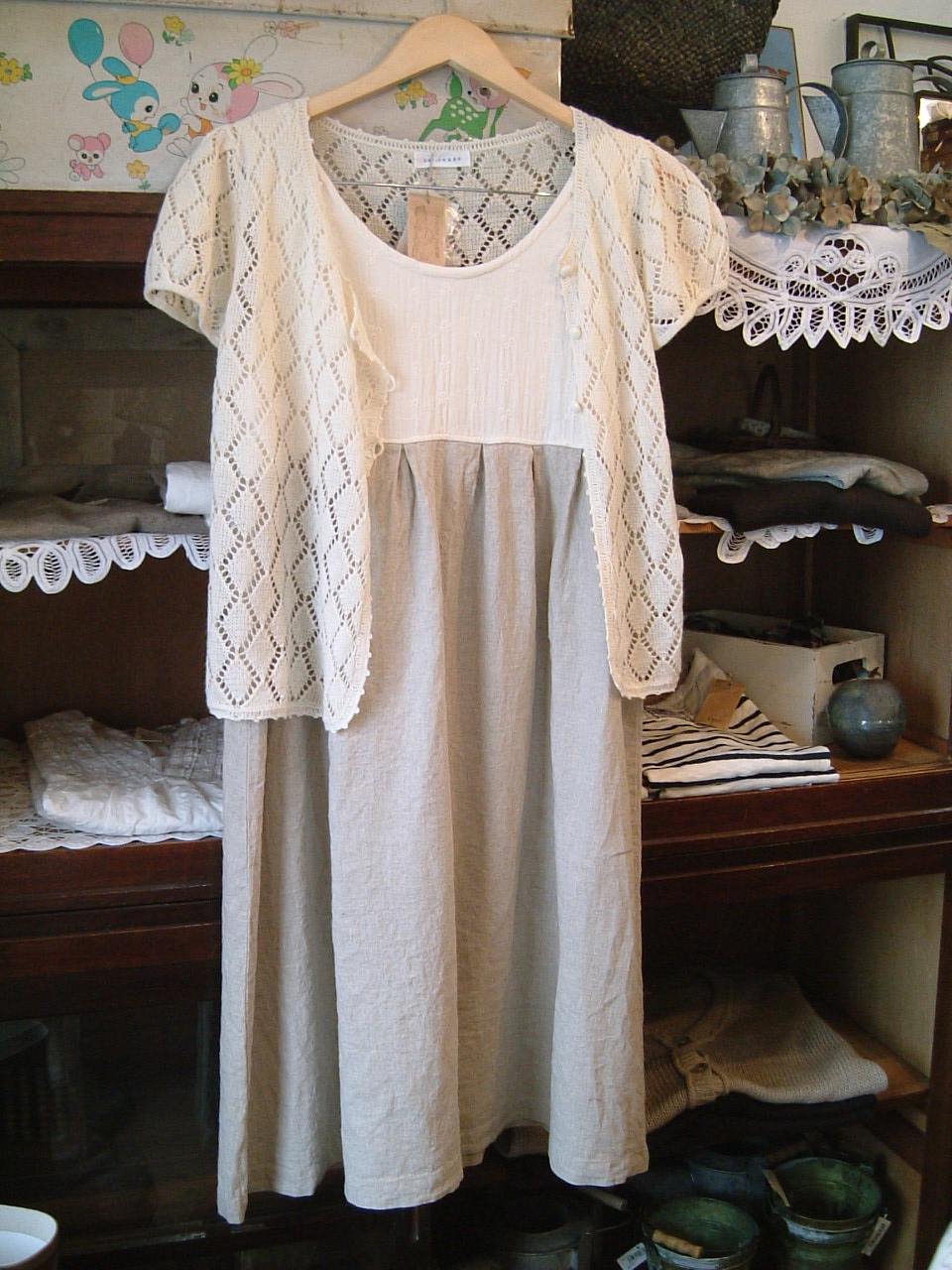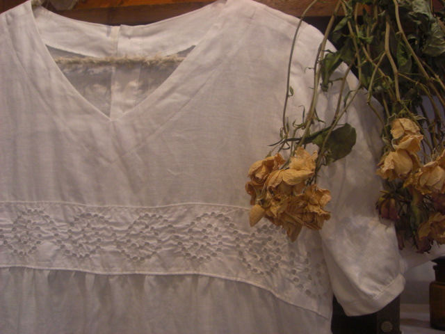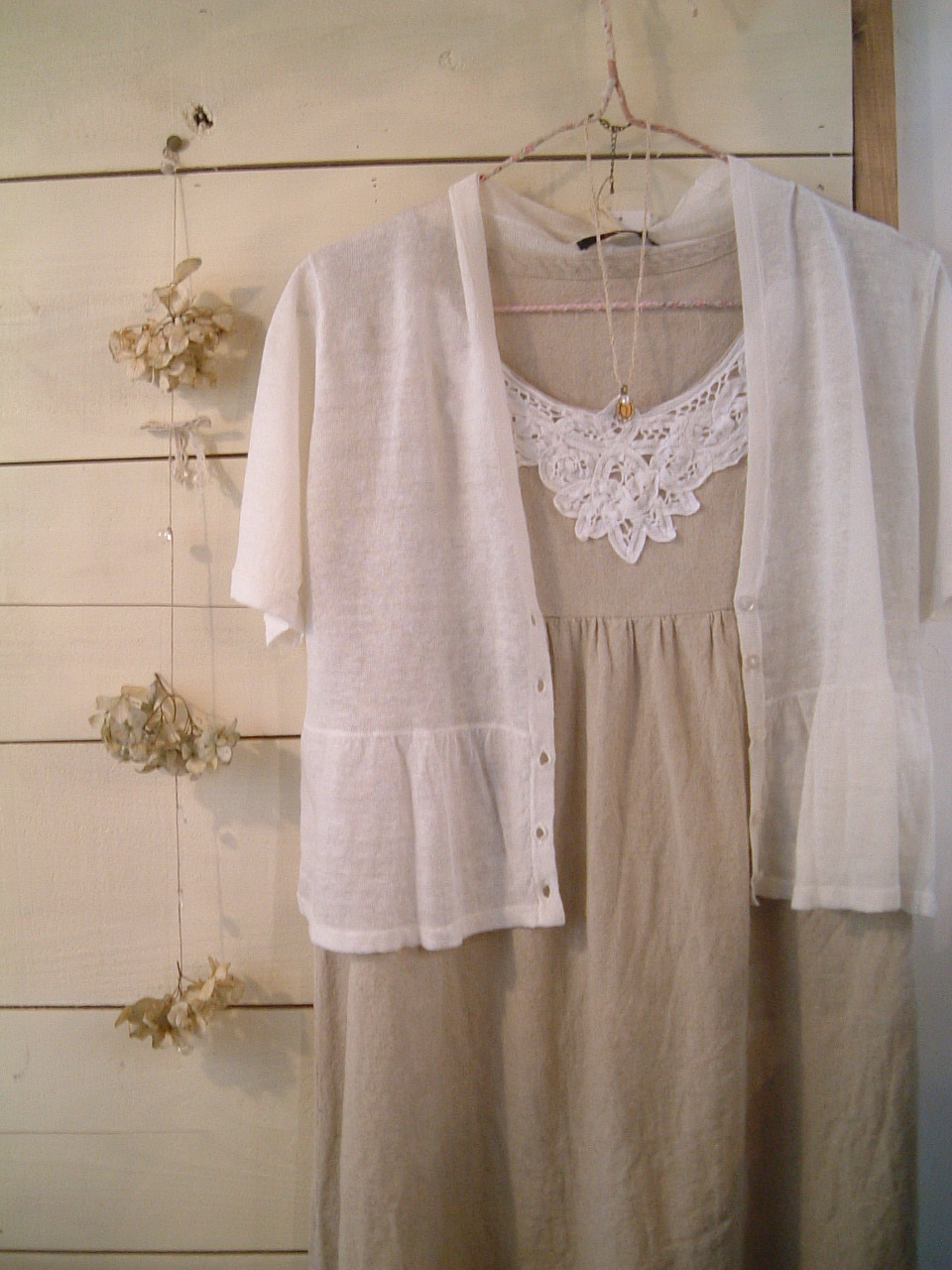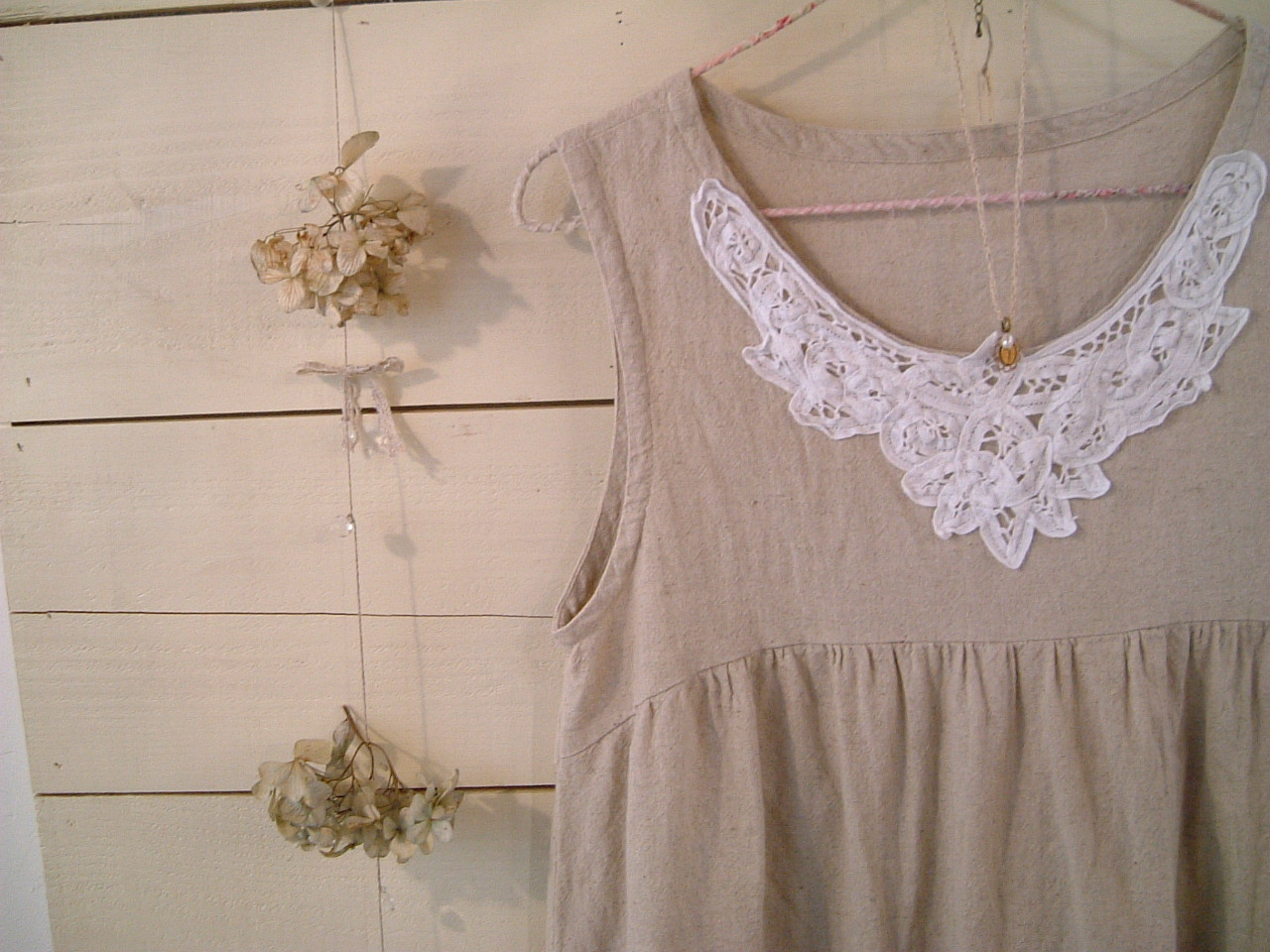 今日の画像は、久しぶりにアンティークレースを使った白リネンのワンピースです。