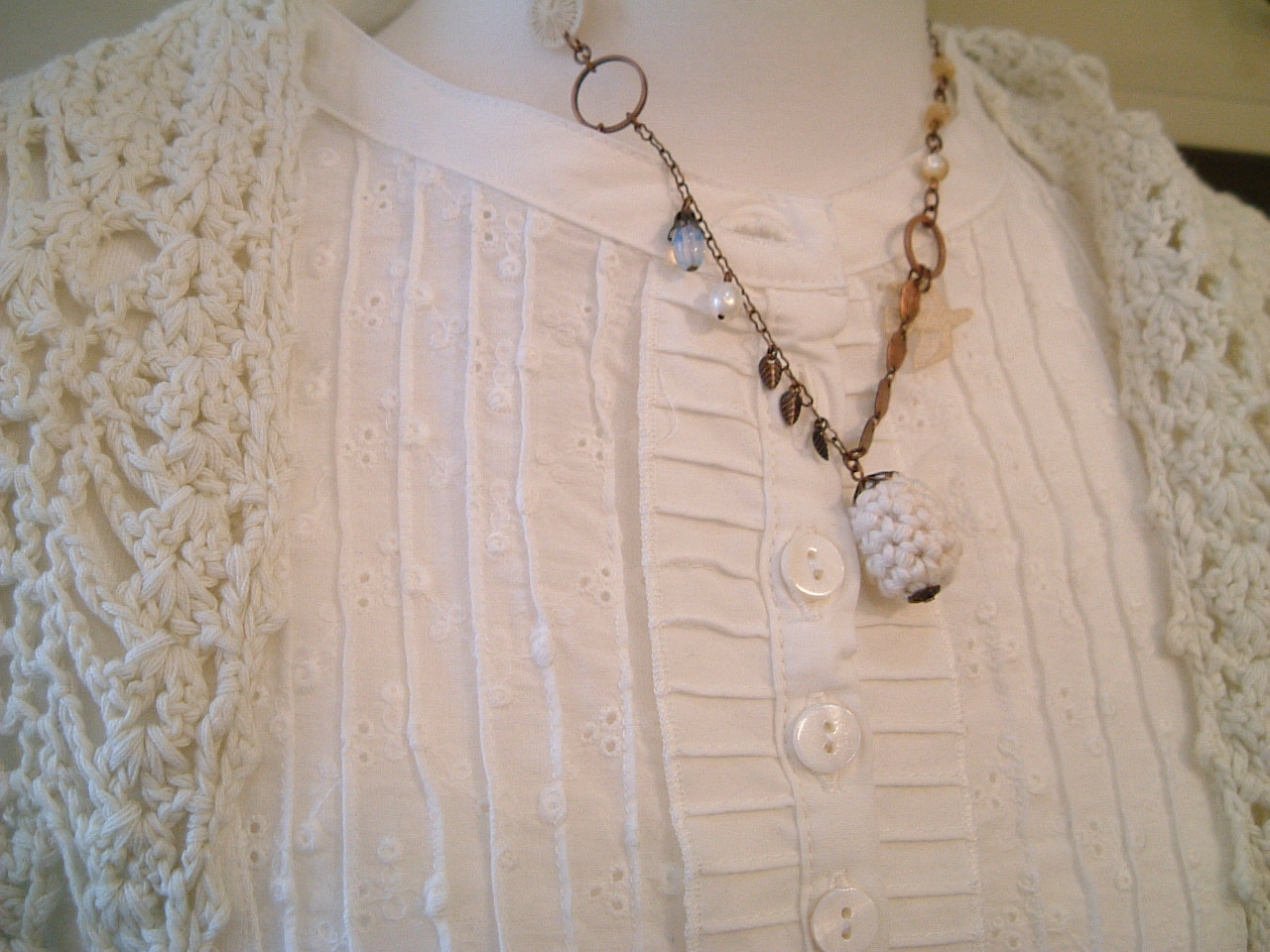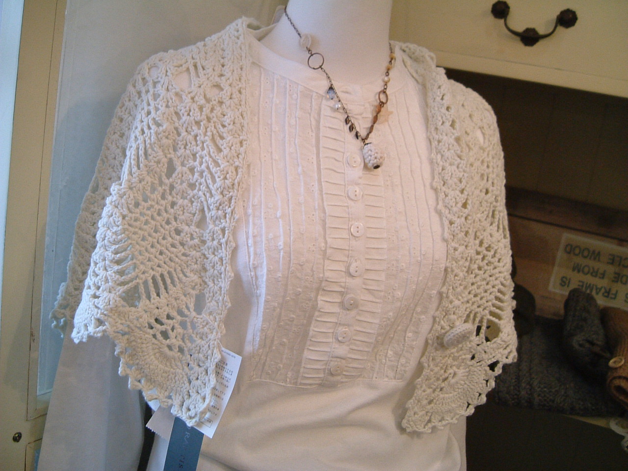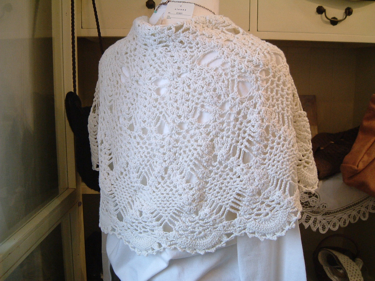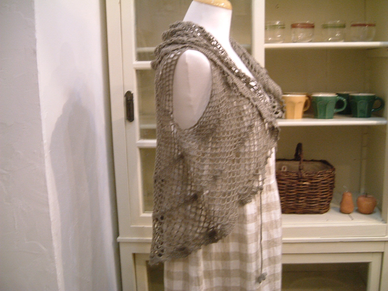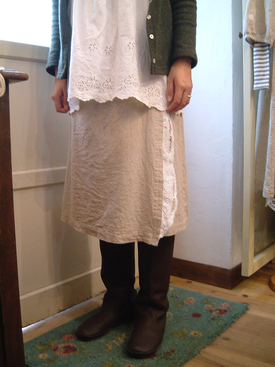 上にコットン100%のショール、大きなくるみボタンで留めてもいい感じ・・・