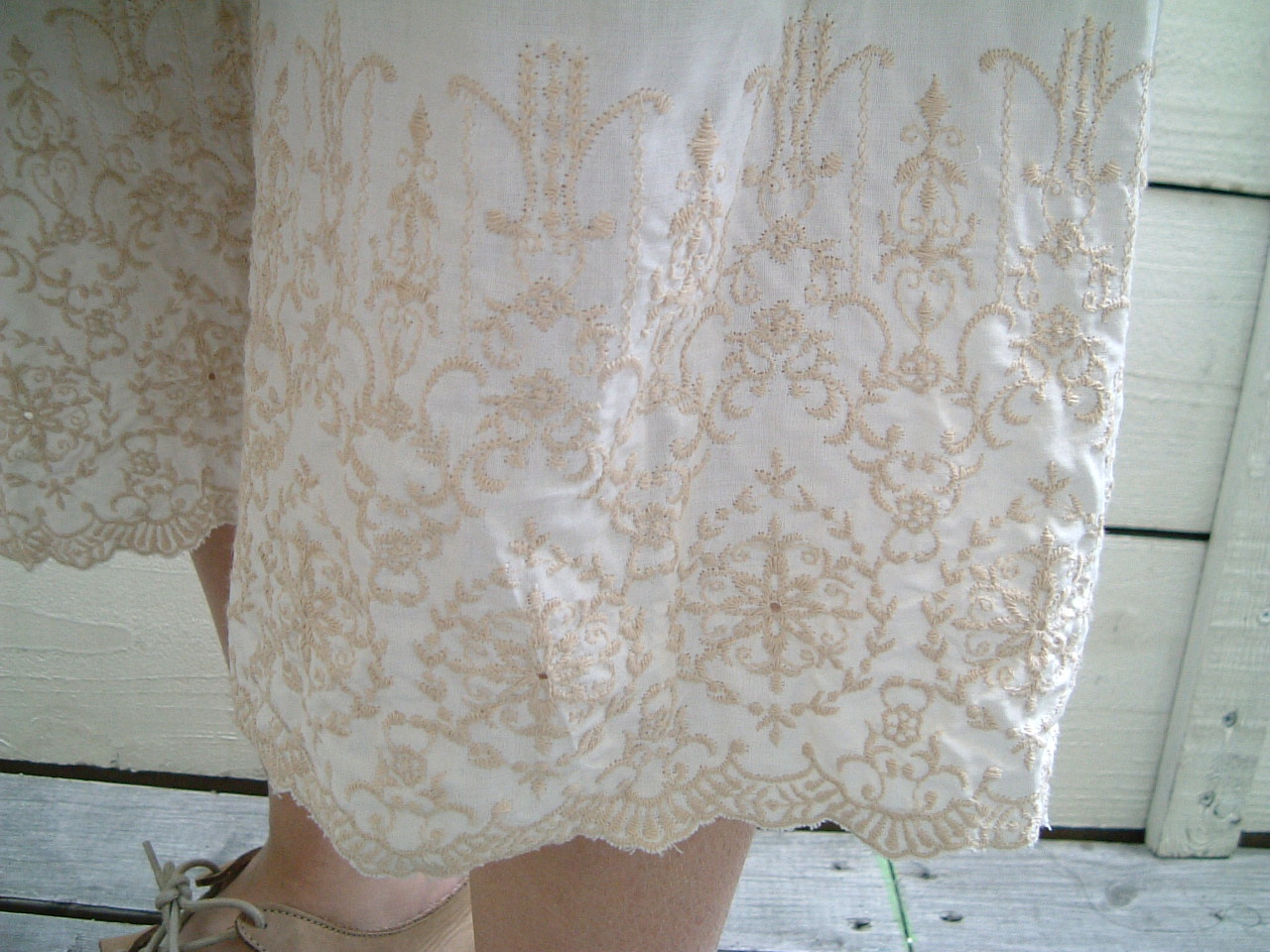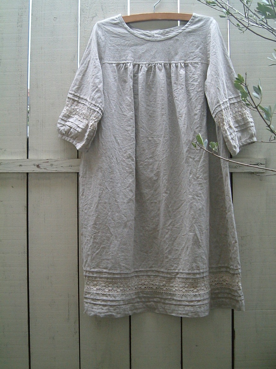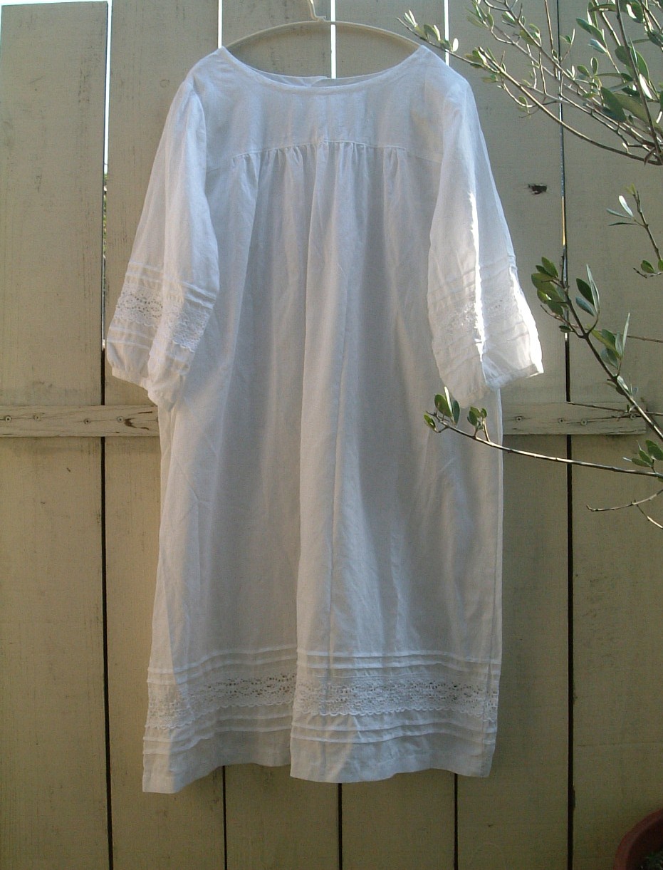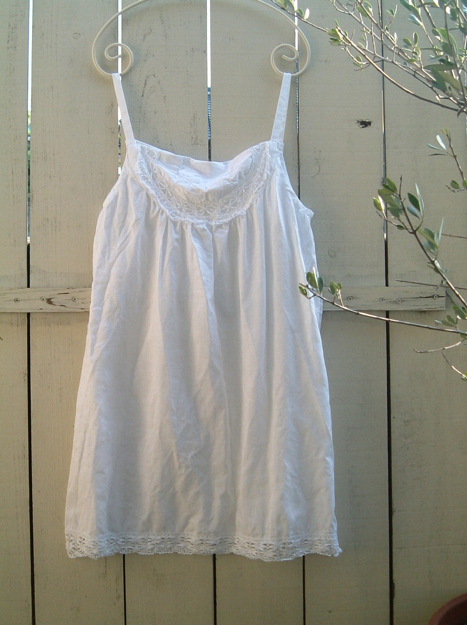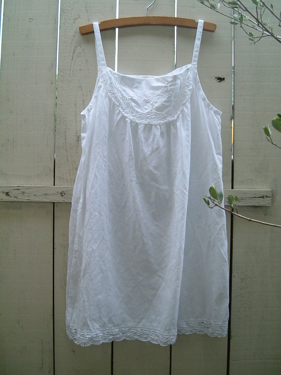 白いリネンのキャミワンピ、ちょっとアンティークリネンのような刺繍が、とても気に入ってます。