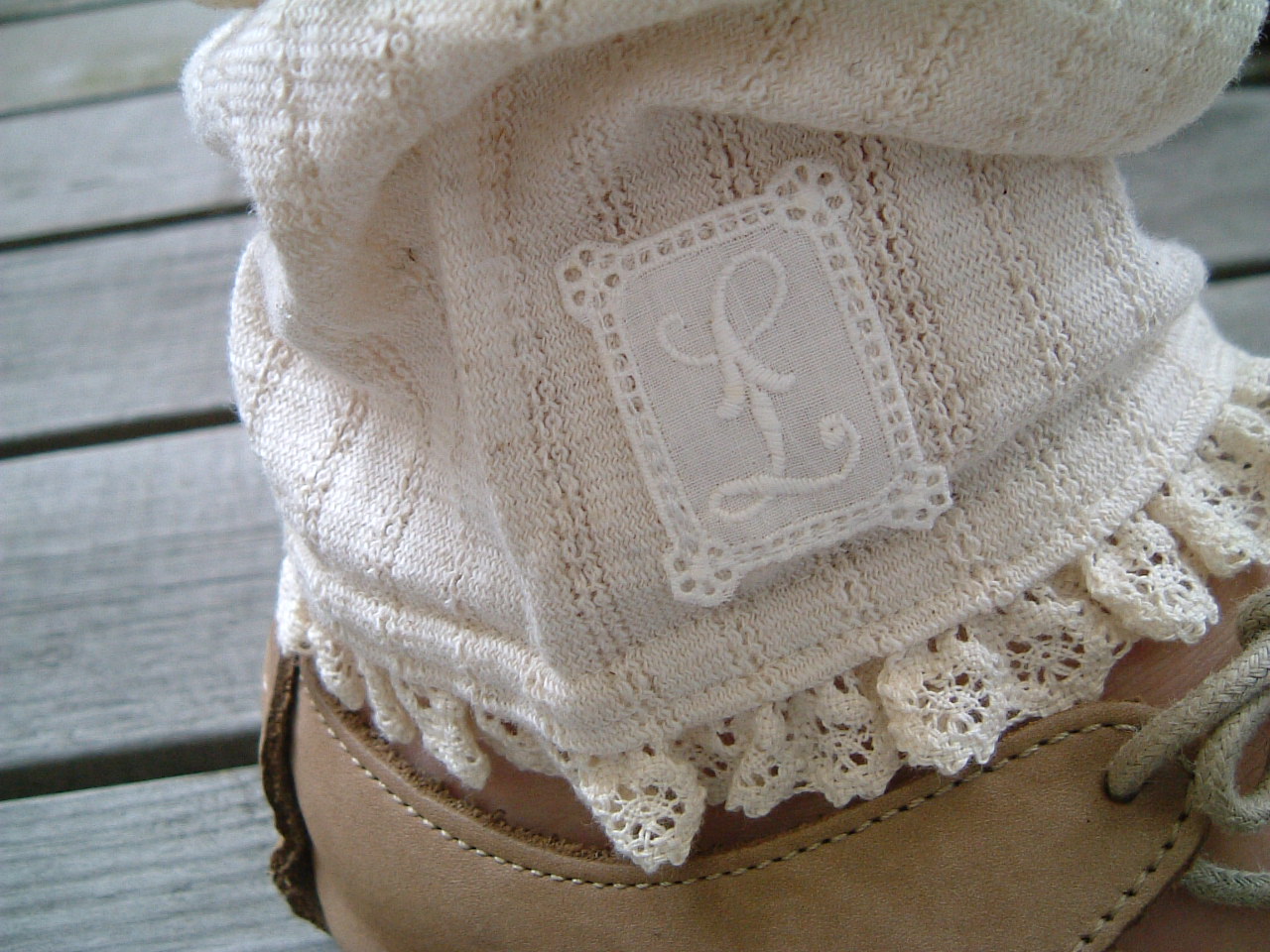 スパッツはアンティークのイニシャルモチーフをつけたくしゅくしゅ履けるスパッツです。