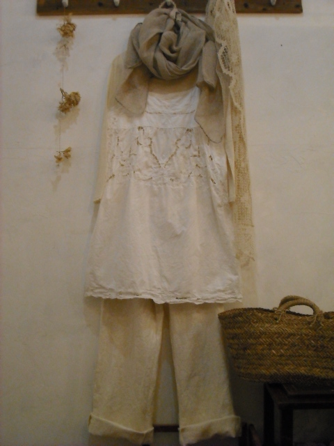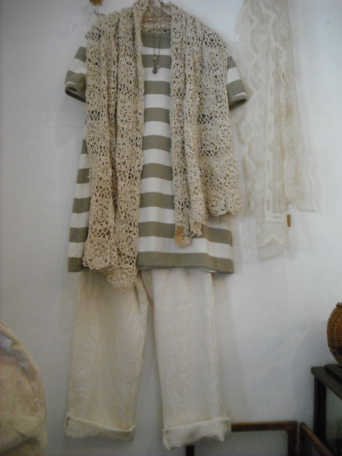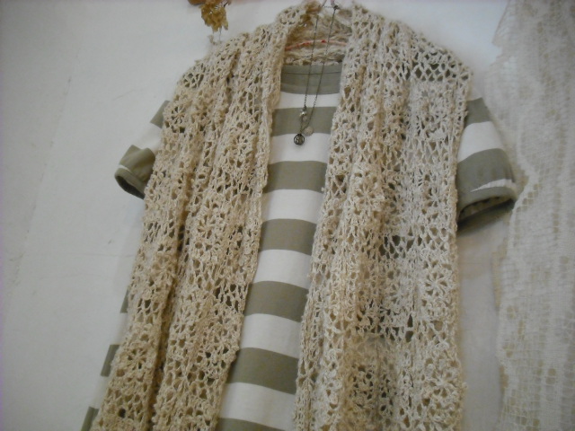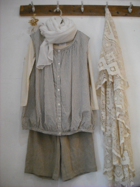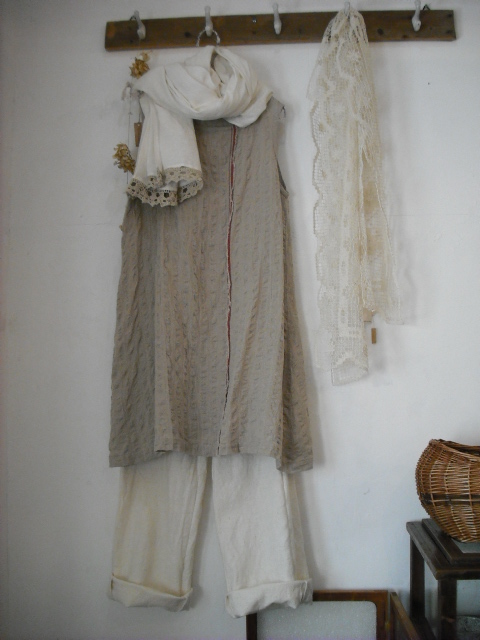 ざっくりリネンのパンツを合わせて、手編みのショールを羽織って・・・